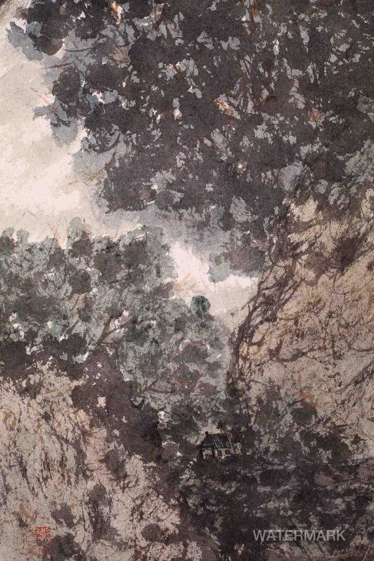 就此作而言,傅抱石對石濤詩意之闡發已盡善盡美,而與梅瞿山之筆法能有幾分相似則很難說。此圖畫法,全是傅氏四十年代初期的繪畫特色,那時『抱石皴』法尚未完全形成,只覺得水墨與皴法融為一體,皴擦點染同時並用,墨瀋淋漓,混沌一片,整體效果很好,而畫面亂頭粗服,略見率性,山石塊面較為含糊;瀑布、闊葉樹用線條鉤勒,松樹杉樹,似也以乾枯潦草之筆為之。也許此處即是學瞿山「畫松入神品」的意思。」
